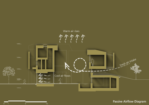 덧붙여 중정의 공간으로 기화열 원리로 인해 시원해진 바람을 들였다. 구체적으로 설명하자면 2층 아랫부분과 지하층 상부 사이의 좁은 높이의 외부 정원 사이로 바람이 들어오게 되는데 이는 기화열을 발생시킨다. 중정으로 들어온 기화열은 상부로 올라가게 되고 그로 인해 시원해진 바람은 중정과 연결된 내부공간으로 들어오게 된다.