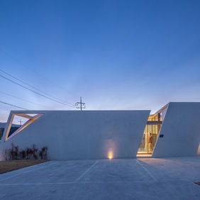 입구의 사선벽체는 우측으로 뉘어져있는데 이는 옆 대지에 연속적으로 지어야하는 구상이 있었기 때문이다.
